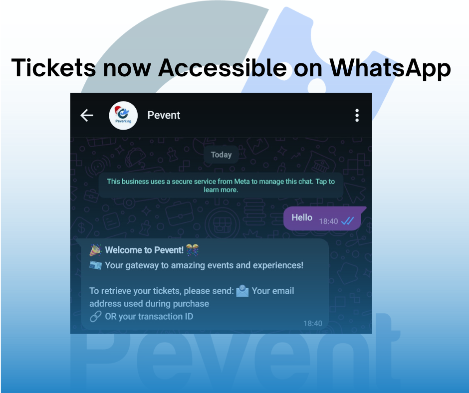 Users donโt need to log into a dashboard or remember passwords. Hereโs how it works. Users enter WhatsApp through a link or chat, they authenticate using their phone number or email. Pevent automatically finds all tickets theyโve already purchased and the tickets are delivered directly inside WhatsApp.